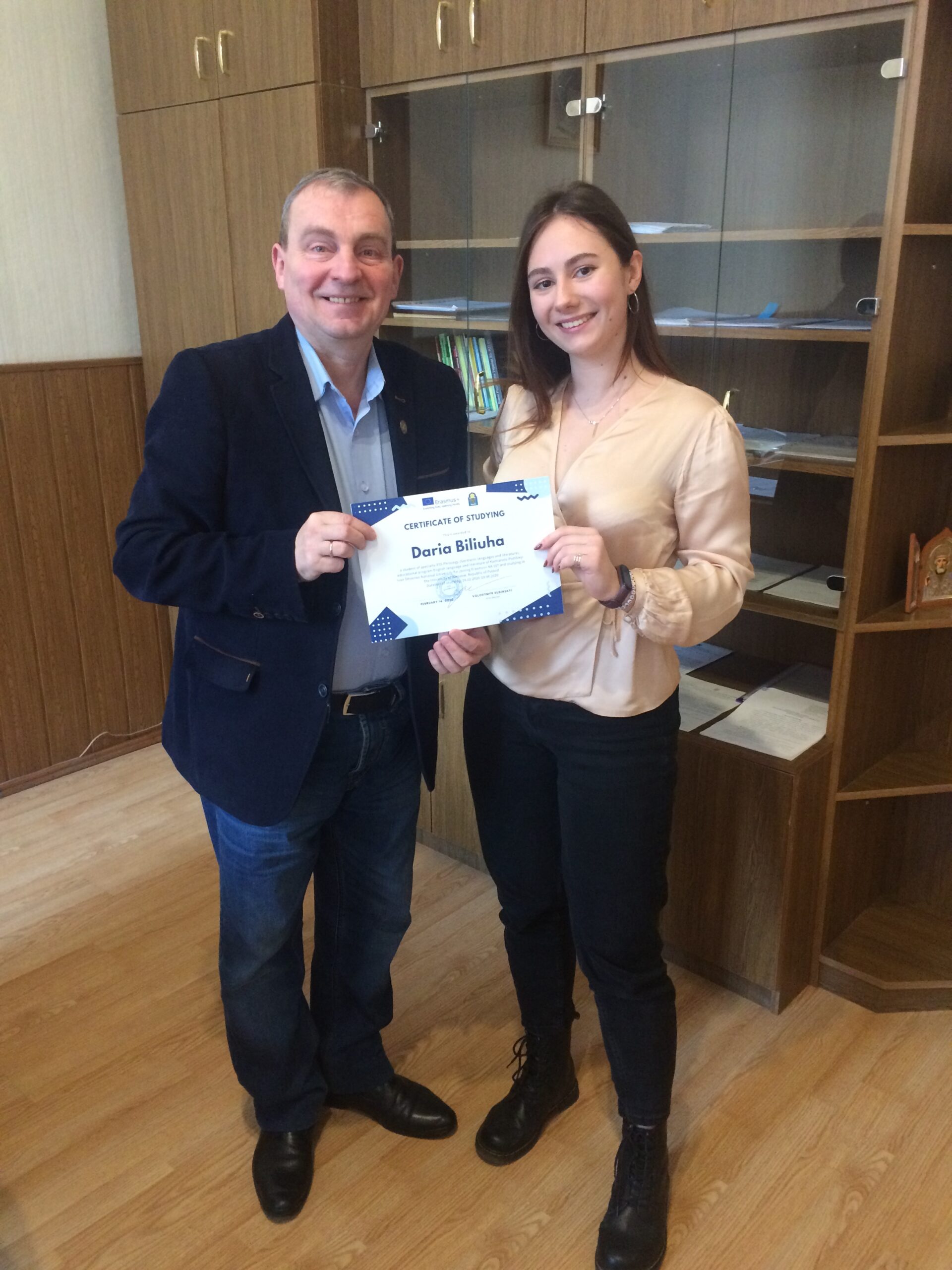 Володимир Дубінський, в.о. ректора, вручив Дар’ї сертифікат на навчання у Жешувському університеті (Республіка Польща) впродовж літнього семестру: 24.02 по 19.06 2020 року. Студентка навчатиметься за фахом Англійська філологія.