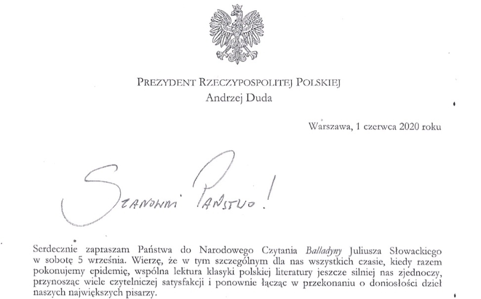 Університет Огієнка отримав лист від Секретаріату Державної Канцелярії Республіки Польща. В листі президент Анджей Дуда звертається до студентської спільноти із запрошенням взяти участь у цьогорічних читаннях, адже це важливий момент єднання для всіх нас, особливо в час епідемії. Подія відбудеться 5 вересня 2020 року. Твором для спільного прочитання стане драма Юліуша Словацького «Балладина».