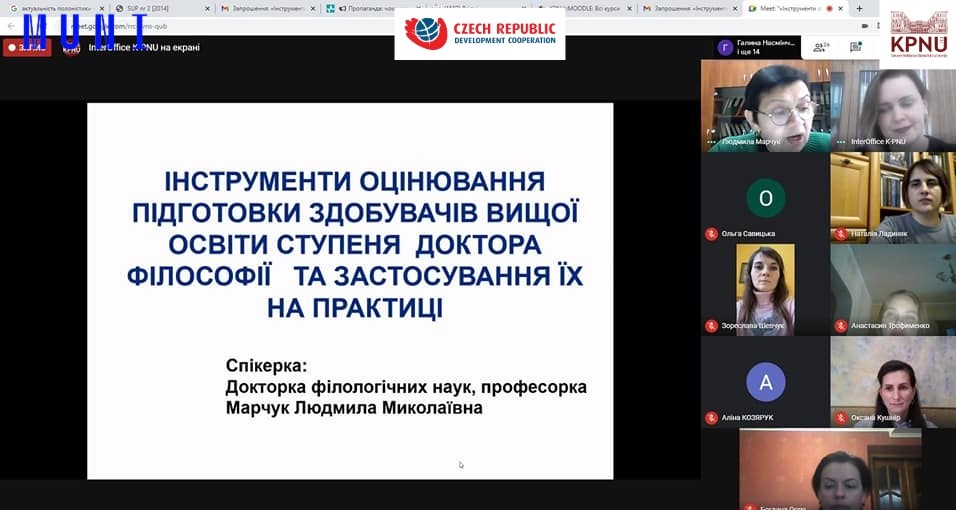 Тему онлайн-семінару «Інструменти оцінювання підготовки здобувачів вищої освіти ступеня доктора філософії та застосування їх на практиці» підготувала й презентувала докторка філологічних наук, професорка Людмила Миколаївна Марчук. Людмила Миколаївна зосередила увагу на принципах та критеріях оцінювання освітньо-професійних та освітньо-наукових програм, показала чеську вищу освіту в основних цифрах та висвітлила структуру навчання у ЗВО Чехії. Окремо спікерка зупинилася на поясненні питання, яке стосувалося основних чинників підвищення якості освіти, схарактеризувала зовнішні діяльні суб’єкти, розповіла про роль фінансування у визначенні якості освіти чеських колег.