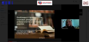 Кандидат філософських наук, доцент Маріанна Петрівна Плахтій в межах проєкту підготувала для учасників онлайн-зустрічі доповідь на тему «Особливості провадження наукової діяльності університетів у сучасних реаліях». Маріанна Петрівна охарактеризувала складники провадження наукової діяльності у ЗВО: візія МОН¸ візія університету, візія науково-педагогічного працівника; описала новації фінансування вищої освіти за формулою в Україні та провела порівняльний аналіз розподілу коштів в Університеті Масарика.