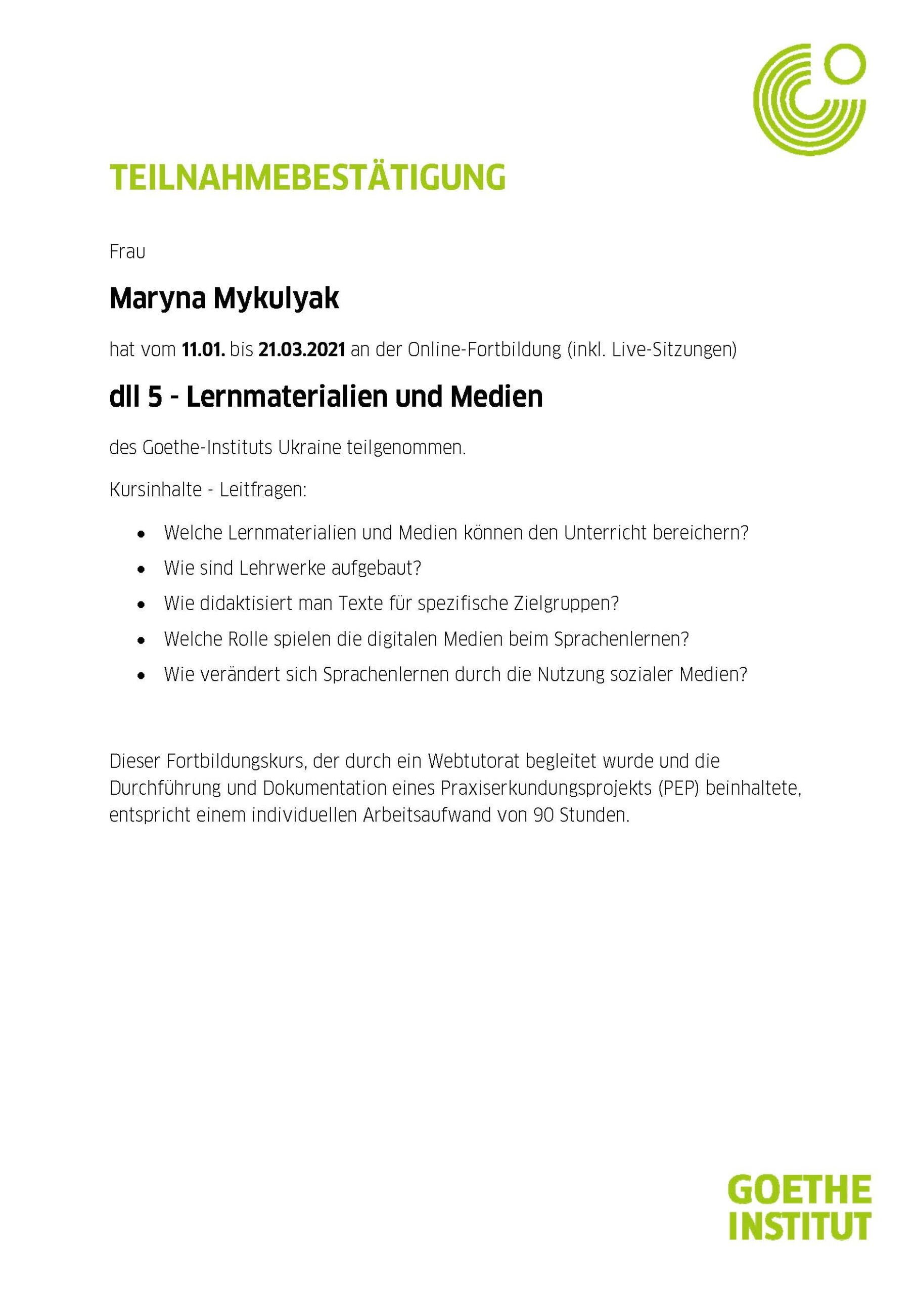 Викладач кафедри німецької мови Марина Микуляк успішно завершила курси підвищення кваліфікації (онлайн) “dll 5 – Lernmaterialien und Medien”, які відбувалися за підтримки Goethe-Institut.