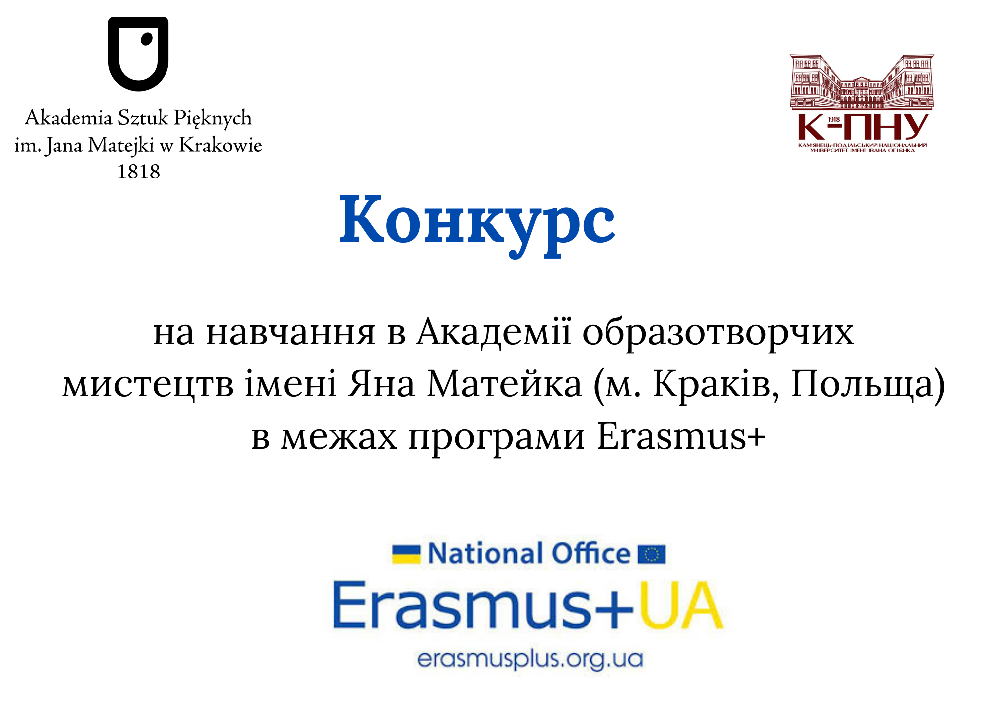 14 червня 2021 року відбудеться конкурс серед здобувачів вищої освіти Університету Огієнка на навчання в Академії образотворчих мистецтв імені Яна Матейка (м. Краків, Польща) у межах програми Erasmus+.
