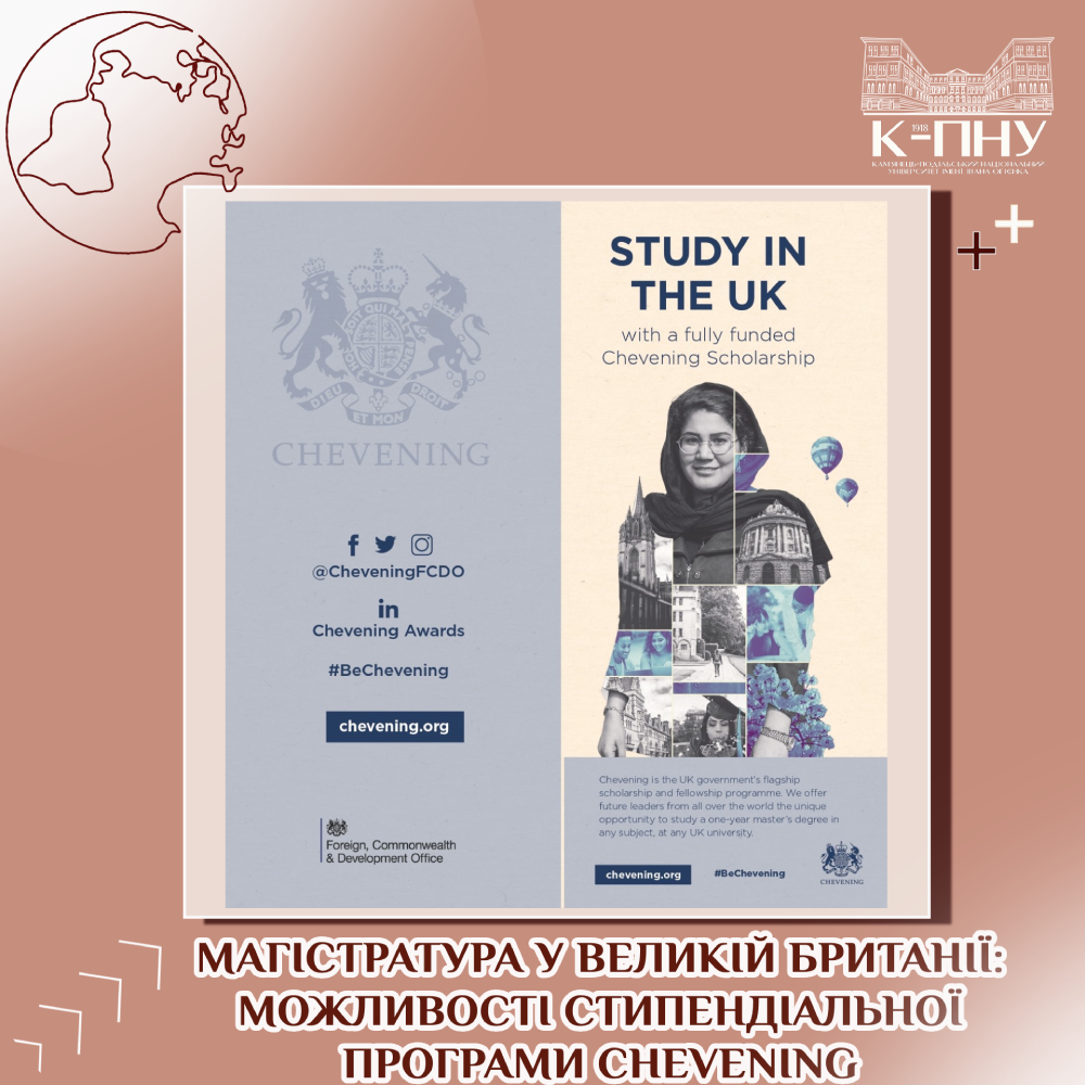 Chevening Scholarship – міжнародна стипендіальна програма, яка дозволяє студентам із понад 160 країн світу здобути магістерський ступінь у Британських університетах. Фінансує програму Міністерство закордонних справ і справ Співдружності націй Великої Британії. Стипендія покриває вартість навчання, витрати на проживання та авіапереліт. Більше ніж 450 українців уже скористалися цією програмою.