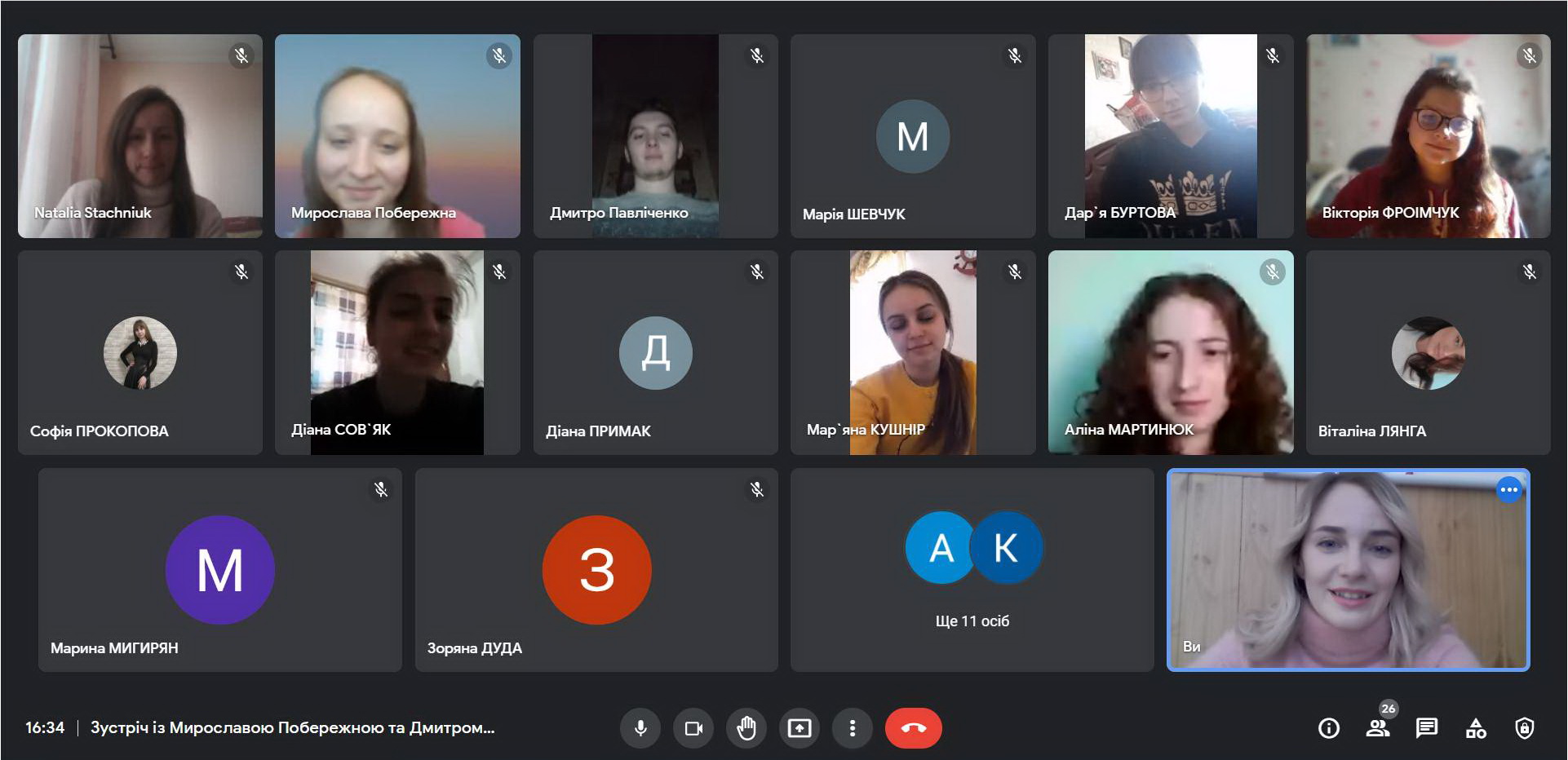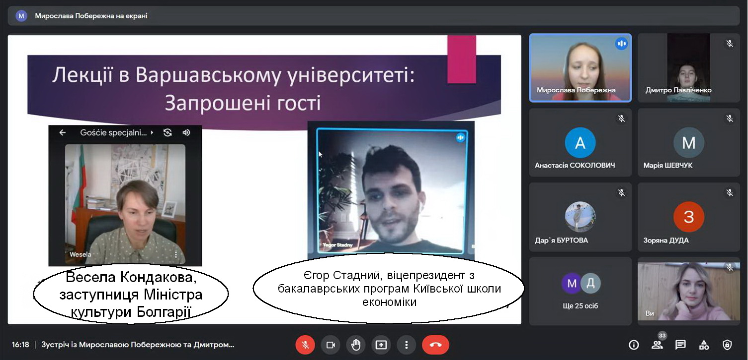24 березня на платформі Google Meet відбулась зустріч із Мирославою Побережною, студенткою спеціальності 014 Середня освіта (Англійська мова та зарубіжна література), та Дмитром Павліченком, студентом спеціальності 032 Історія та археологія, які з 28 лютого по 14 березня реалізовували свою мобільність як учасники Східної зимової школи, організованої Центром Східноєвропейських студій Варшавського університету (Республіка Польща).