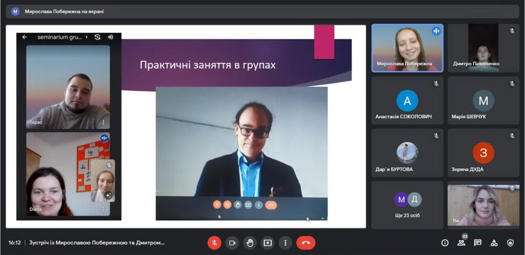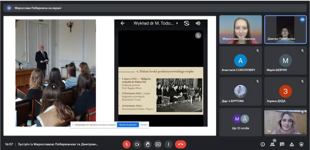 24 березня на платформі Google Meet відбулась зустріч із Мирославою Побережною, студенткою спеціальності 014 Середня освіта (Англійська мова та зарубіжна література), та Дмитром Павліченком, студентом спеціальності 032 Історія та археологія, які з 28 лютого по 14 березня реалізовували свою мобільність як учасники Східної зимової школи, організованої Центром Східноєвропейських студій Варшавського університету (Республіка Польща).