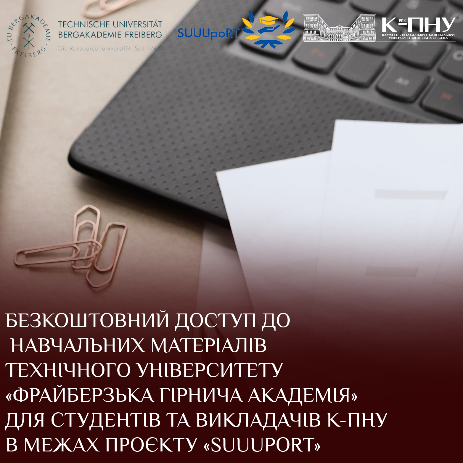 Технічний університет «Фрайберзька гірнича академія» (Німеччина) пропонує безкоштовний доступ до навчальних матеріалів для студентів та викладачів К-ПНУ в межах проєкту«SUUUpoRT – структурна підтримка українських університетів у розвитку та відбудові діяльності вищої освіти у сфері ресурсів і технологій», який фінансується за підтримки «Stiftung innovation Hochschullehre».