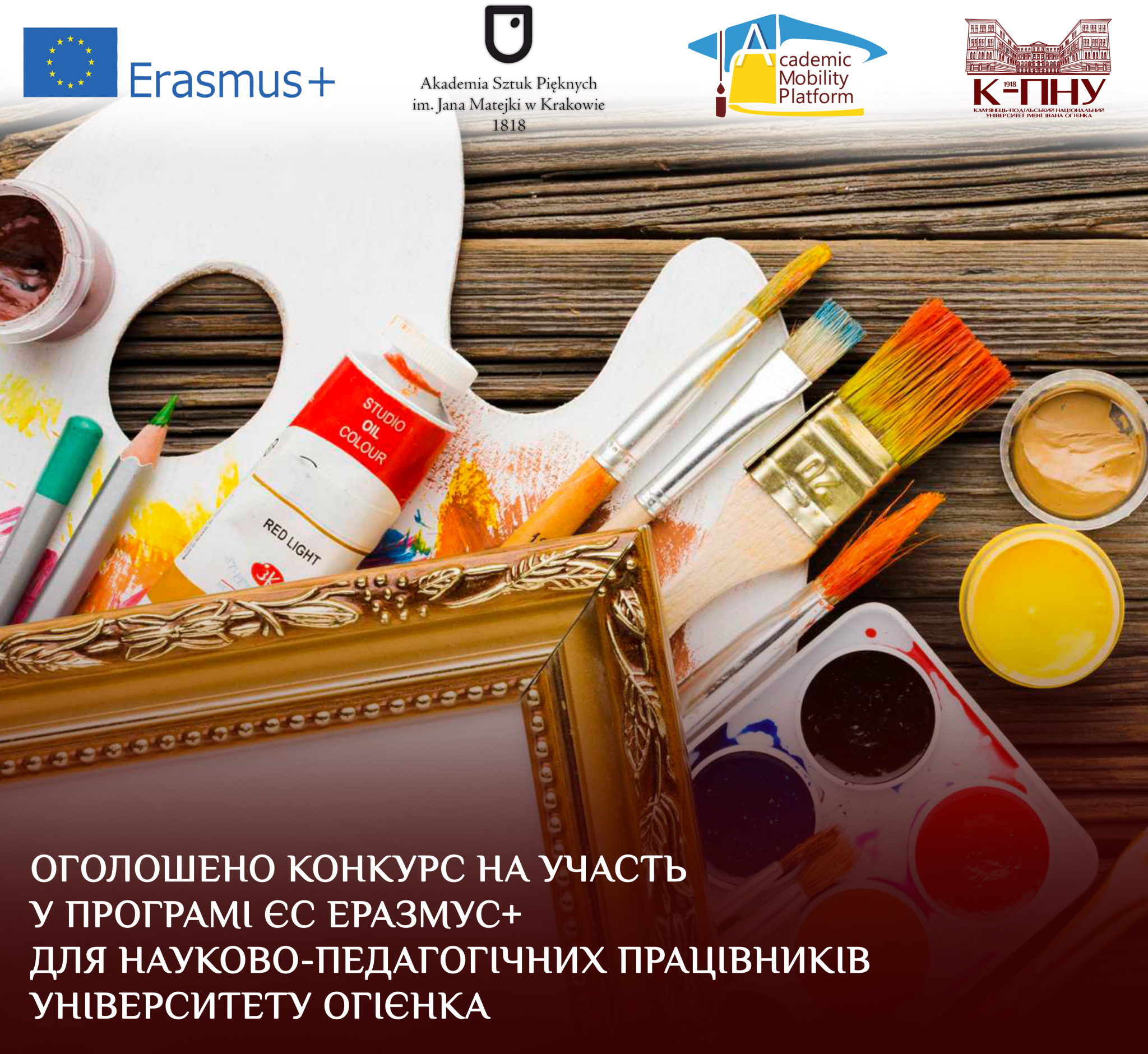 У межах підписаної міжінституційної угоди з Академією образотворчих мистецтв імені Яна Матейка (м. Краків, Республіка Польща) оголошено конкурс на участь у Програмі ЄС Еразмус+ КА171: Міжнародна кредитна мобільність у формі стажування або викладання для науково-педагогічних працівників кафедри образотворчого і декоративно-прикладного мистецтва та реставрації творів мистецтва.