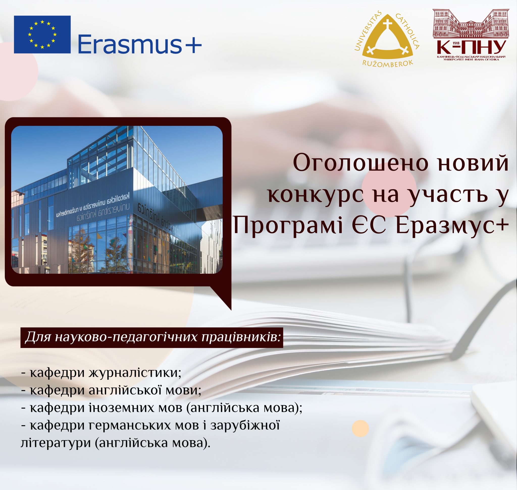 У межах підписаної міжінституційної угоди з Католицьким університетом у Ружомберку (м. Ружомберок, Республіка Словаччина) оголошено конкурс на участь у Програмі ЄС Еразмус+ за напрямом КА171: міжнародна кредитна мобільність для науково-педагогічних працівників Університету Огієнка.