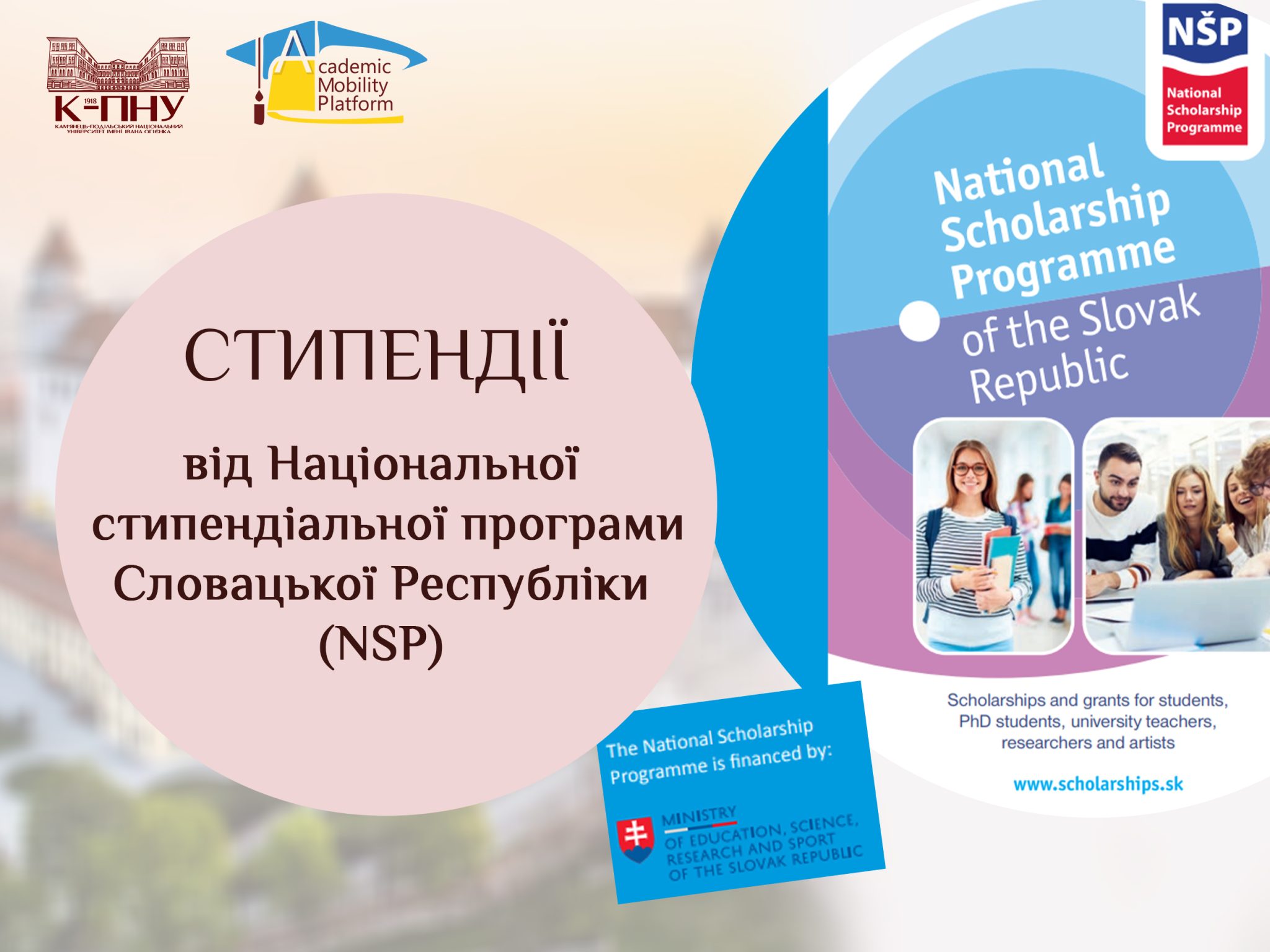 Національна стипендіальна програма Словацької Республіки (NSP) була створена для підтримки мобільності іноземних студентів, докторантів, викладачів ЗВО, дослідників і митців упродовж їхнього навчання чи дослідницької роботи в словацьких ЗВО і дослідницьких організаціях.