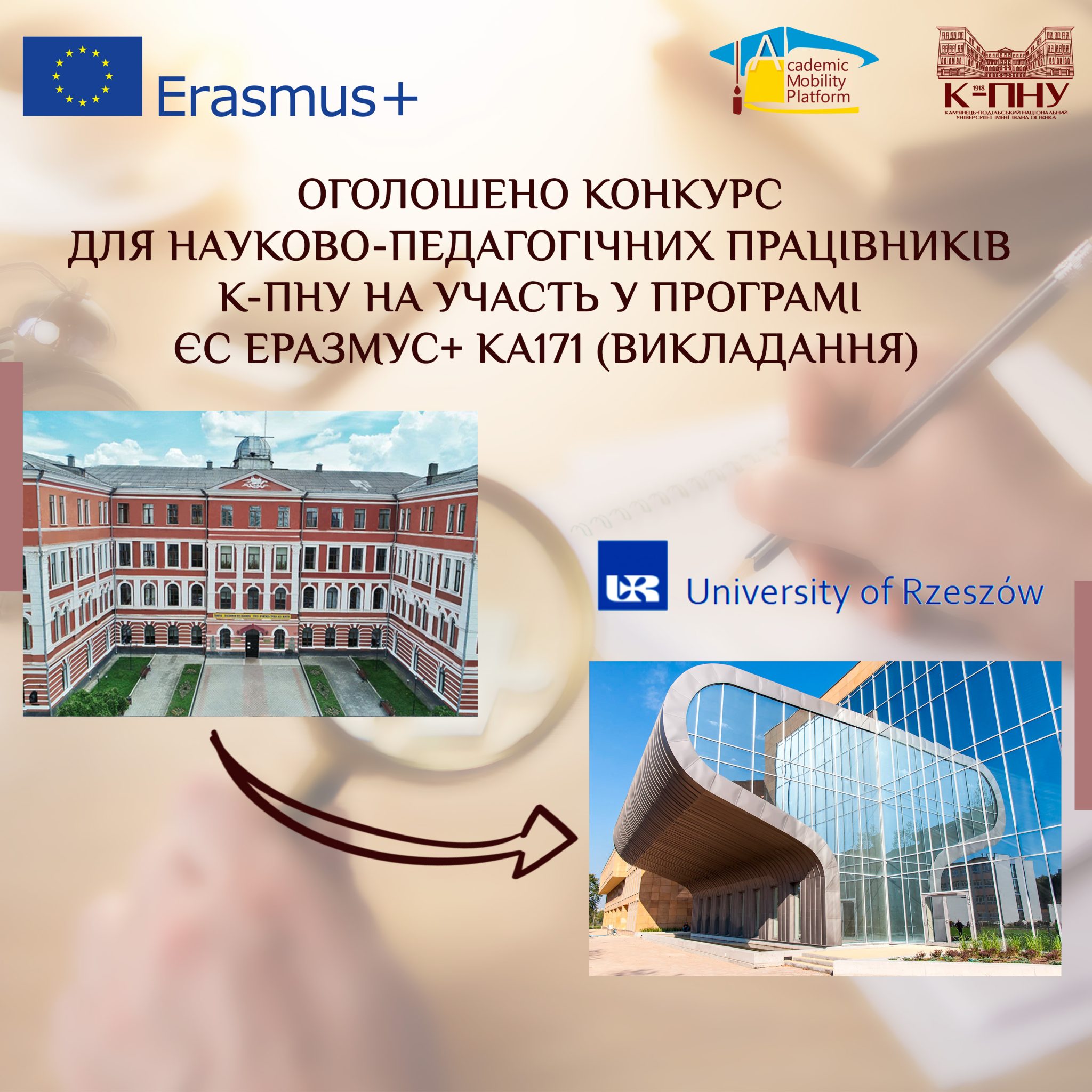 У межах підписаної міжінституційної угоди з Університетом Жешува (м. Жешув, Польща) оголошено конкурс на участь у Програмі ЄС Еразмус+ КА171: міжнародна кредитна мобільність для науково-педагогічних працівників Університету Огієнка.