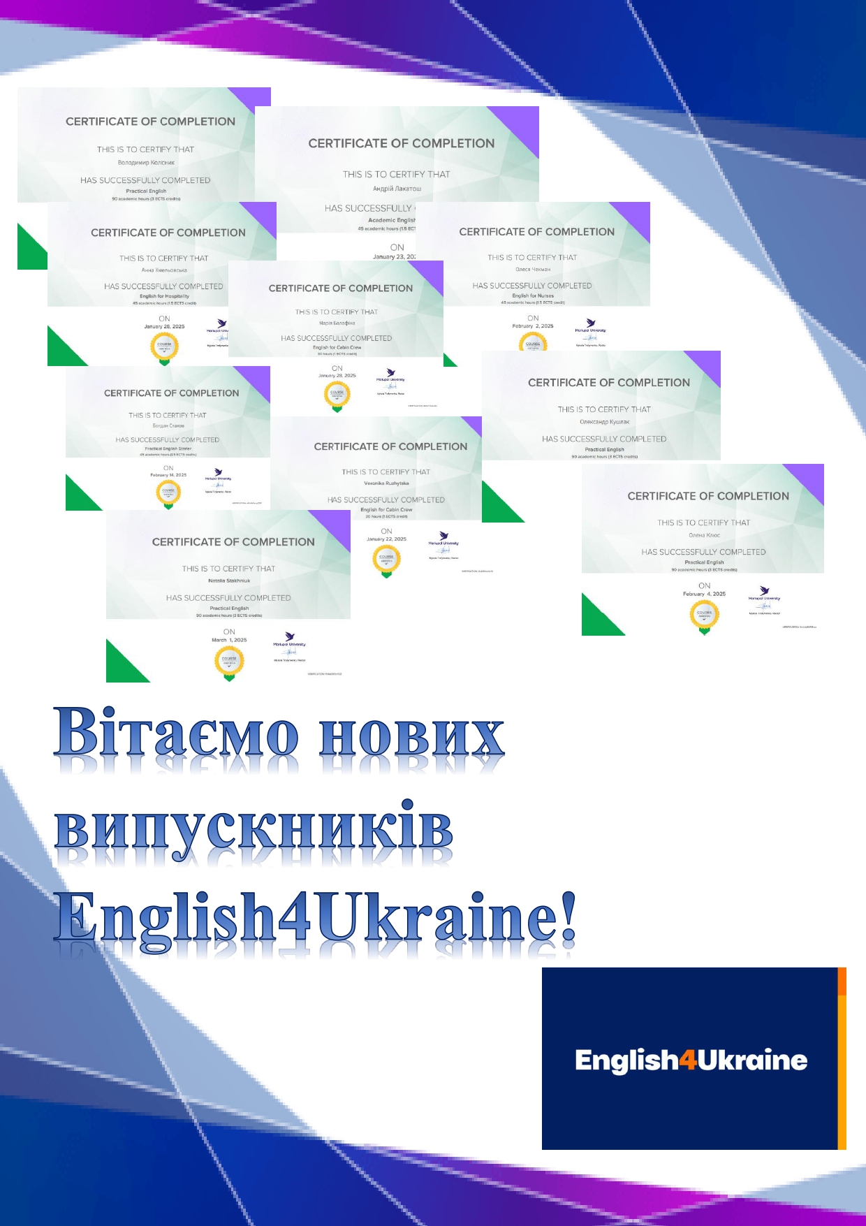 Радо повідомляємо, що ще 30 користувачів успішно завершили навчання на безкоштовних курсах англійської мови в межах проєкту English4Ukraine та отримали сертифікати.