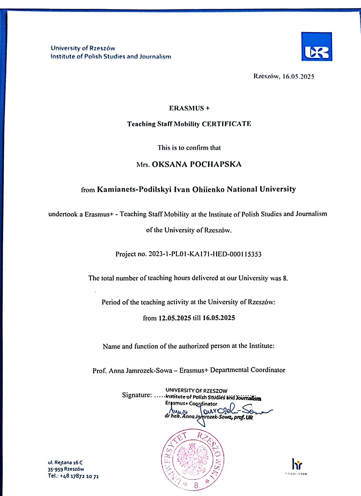 12-16 травня 2025 р. доцент кафедри журналістики Оксана Почапська перебувала в Жешувському університеті (Польща) в межах напряму КА 171 (викладання) Програми ЄС Erasmus+.