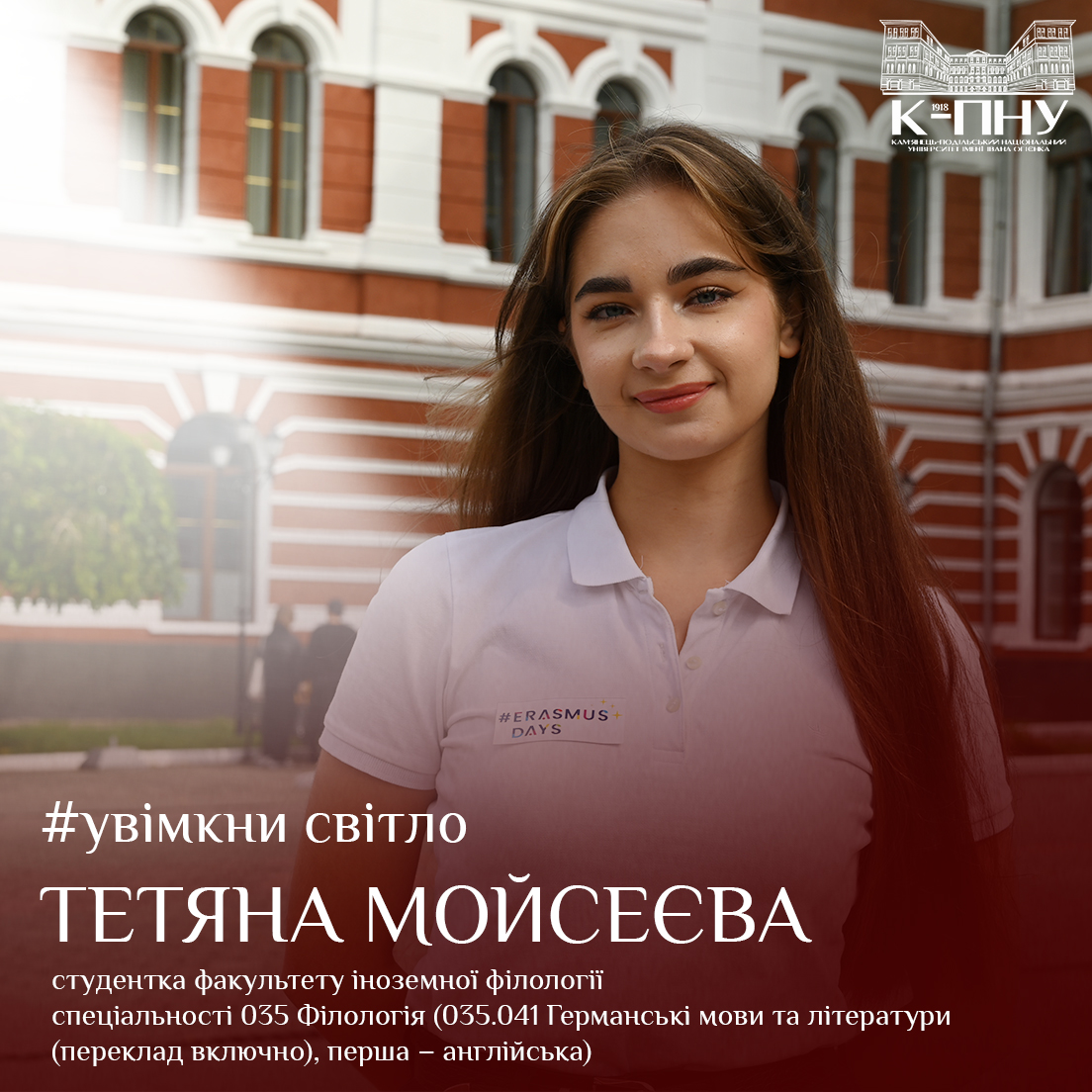 Тетяна Мойсеєва – здобувачка вищої освіти факультету іноземної філології спеціальності 035 Філологія (035.041 Германські мови та літератури (переклад включно), перша – англійська).