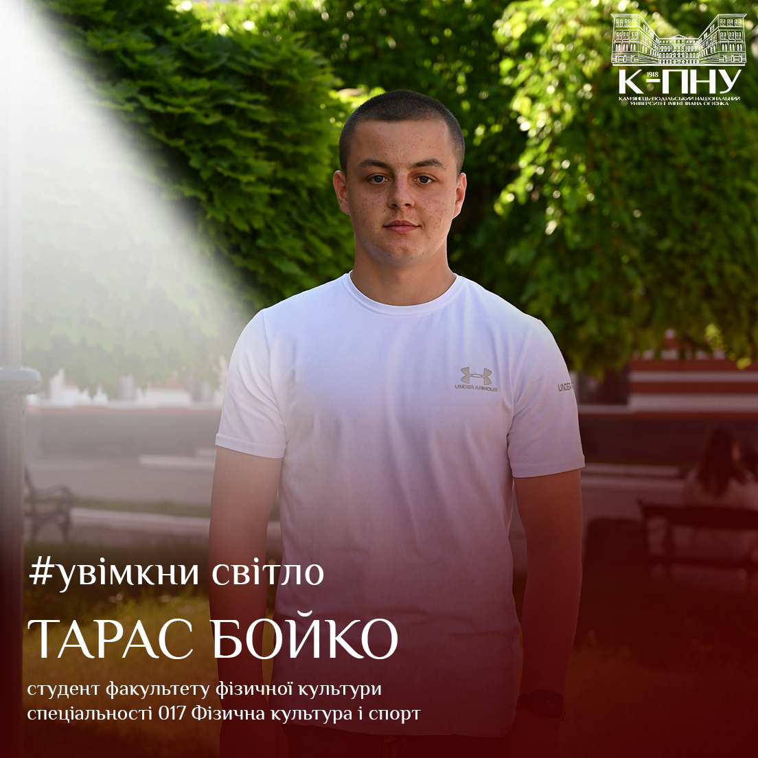 Тарас Бойко – здобувач освіти 2 курсу денної форми здобуття вищої освіти зі спеціальності 017 Фізична культура і спорт за освітньо-професійною програмою «Тренер з видів спорту» першого (бакалаврського) рівня вищої освіти факультету фізичної культури, учасник Програми ЄС Еразмус+ за напрямом КА171: міжнародна кредитна мобільність у формі навчання в Люблянському університеті (Республіка Словенія).