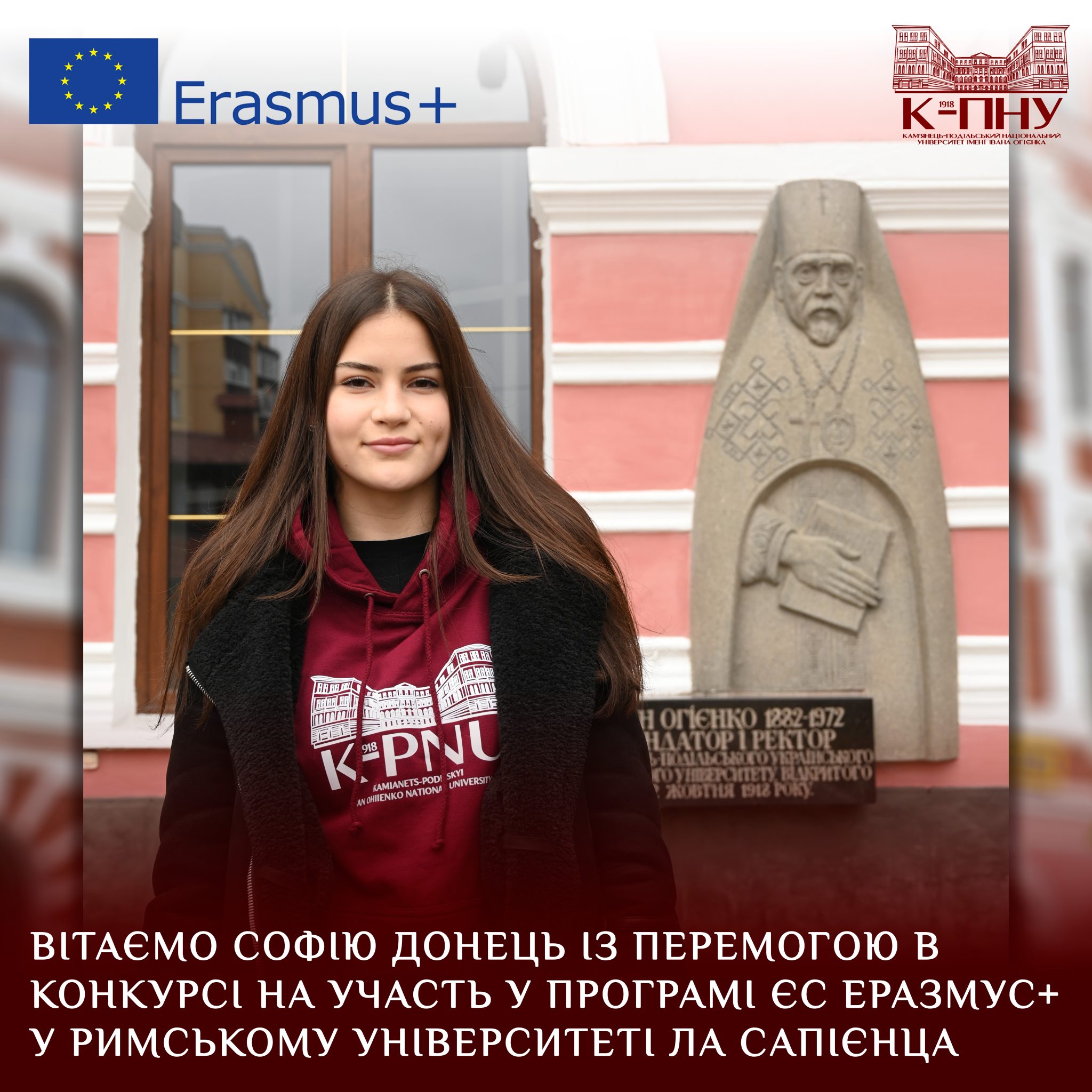 Вітаємо Софію Донець, здобувачку вищої освіти першого (бакалаврського) рівня галузі знань 03 Гуманітарні науки, спеціальності 035 «Філологія», спеціалізації 035.041 Германські мови та літератури (переклад включно), перша – англійська, факультету іноземної філології з перемогою в конкурсі, який проводив Римський університет Ла Сапієнца на участь у Програмі ЄС Еразмус+ (КА171).