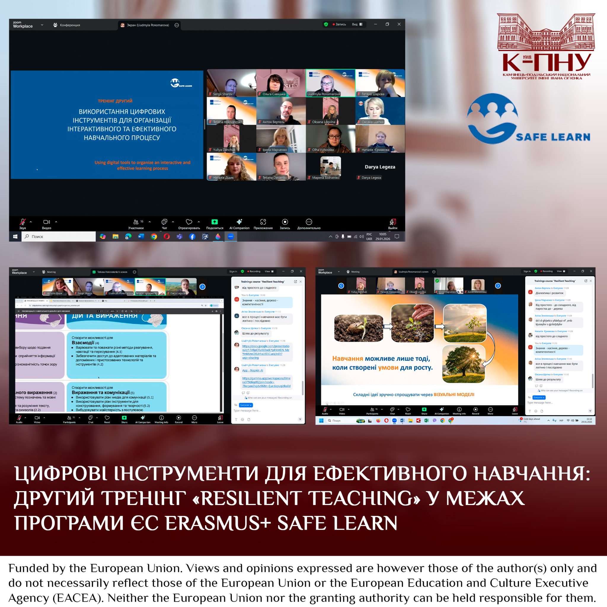 29 січня в межах проєкту Програми ЄС Еразмус+ Supporting Adaptive and Flexible for War-Affected Ukraine Students (Підтримка адаптивної та гнучкої освіти для студентів в Україні, які постраждали від війни) 101236049-SAFE LEARN ERASMUS-EDU-2025-CBHE відбувся другий тренінг «Resilient Teaching».