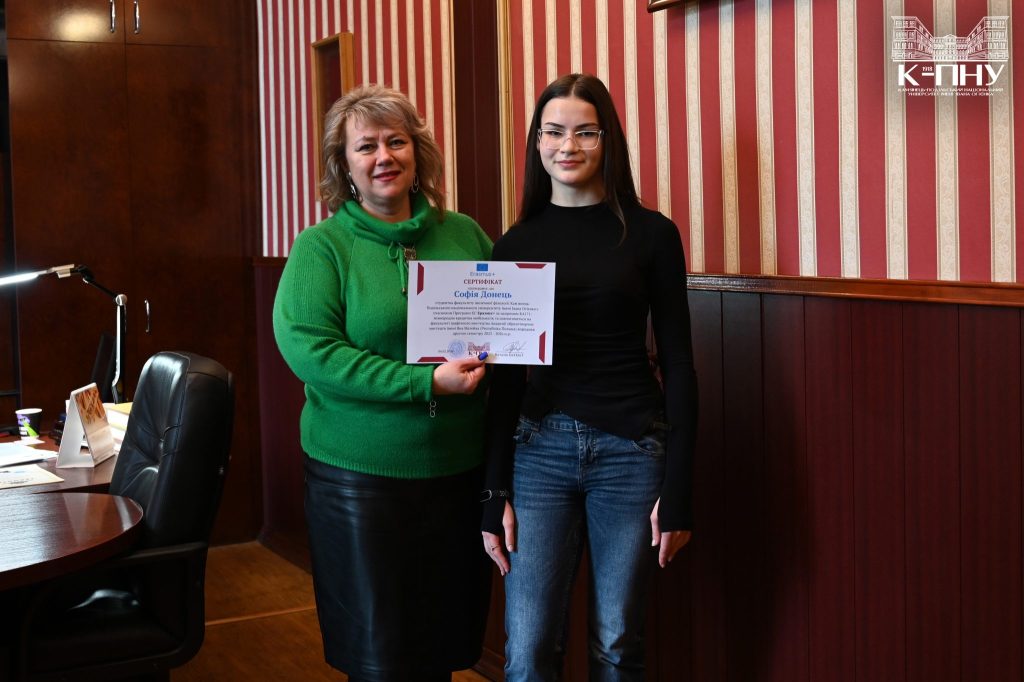 У межах Програми Європейського Союзу Erasmus+ відбулося вручення сертифікатів здобувачам вищої освіти – учасникам міжнародної академічної мобільності. Сертифікати вручила в.о. ректора Наталія Бахмат і привітала студентів із початком важливого етапу їхнього академічного та професійного розвитку.