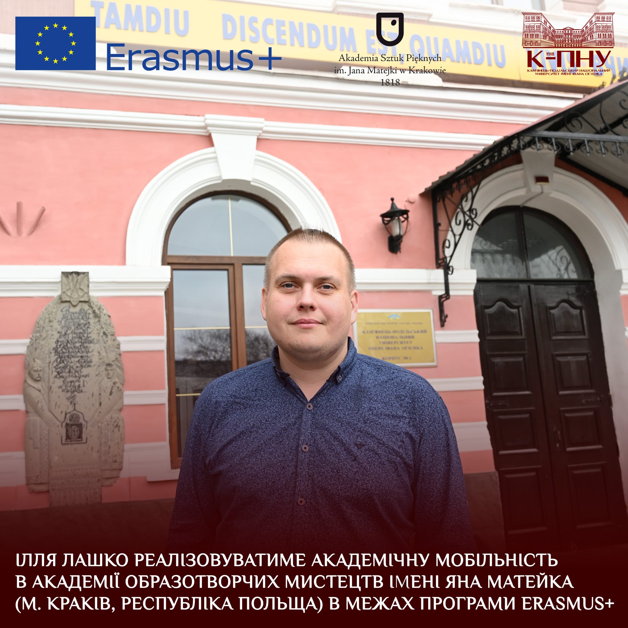 Вітаємо Іллю Лашко, асистента кафедри образотворчого і декоративно-прикладного мистецтва та реставрації творів мистецтва Кам’янець-Подільського національного університету імені Івана Огієнка, з успішним проходженням конкурсного відбору, проведеним Академією образотворчих мистецтв імені Яна Матейка (м. Краків, Республіка Польща)