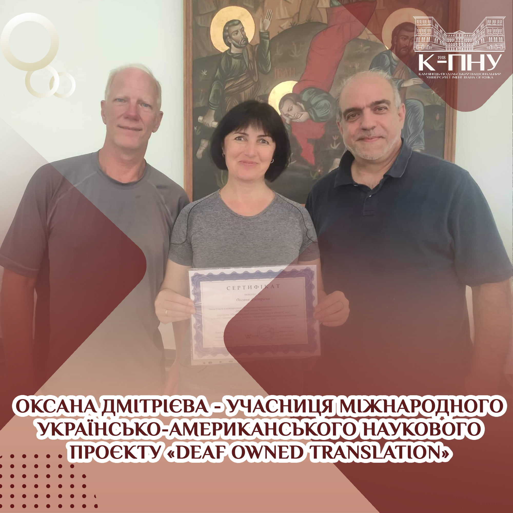 У ролі співкоординатора проєкту і наукового консультанта-перекладача Євангелія на українську жестову мову у проєкті брала участь Оксана Дмітрієва, кандидат педагогічних наук, доцент кафедри спеціальної та інклюзивної освіти К-ПНУ.