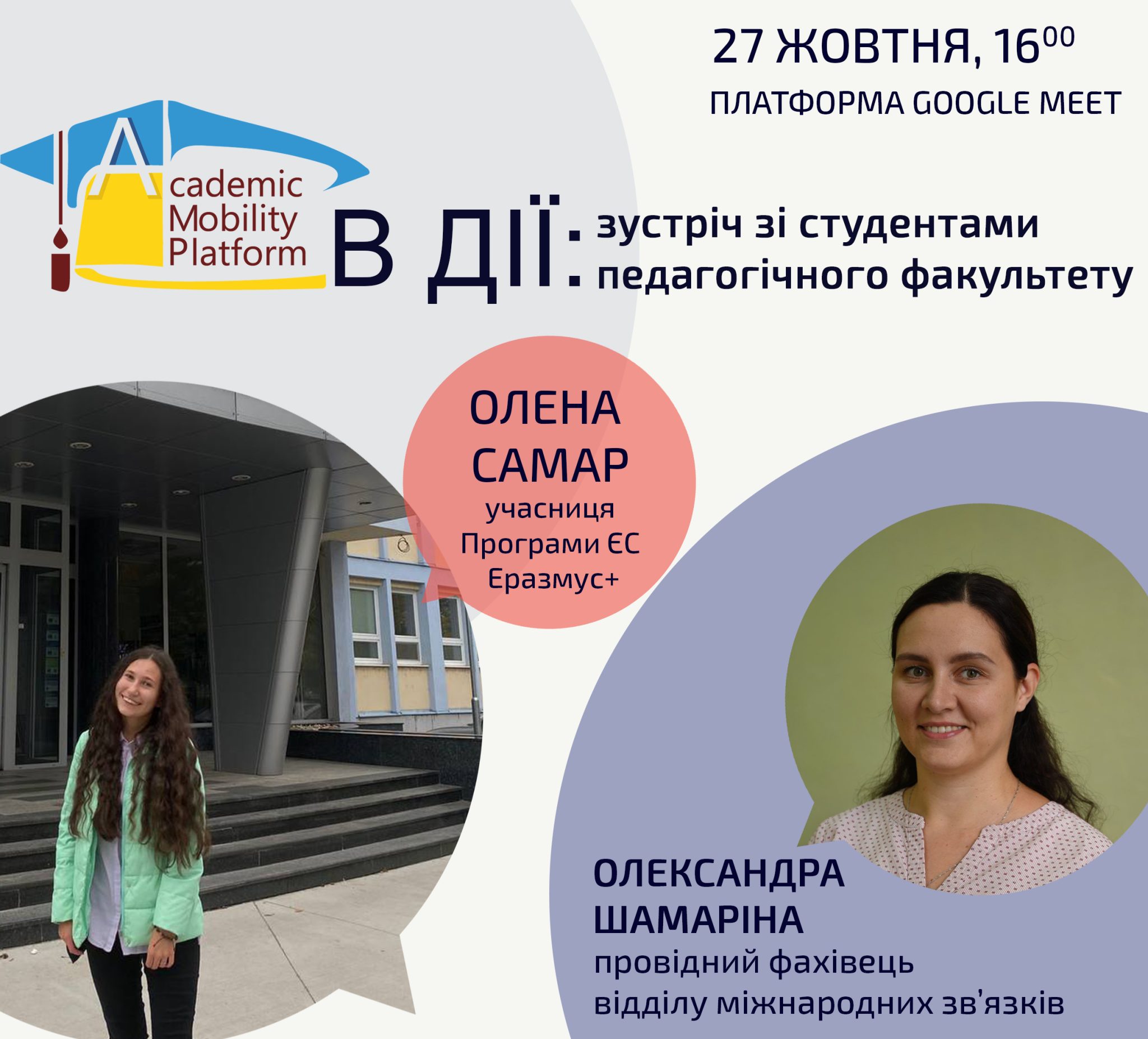 Щотижня організовуються онлайн-зустрічі зі студентами різних факультетів, на яких Олександра Шамаріна, провідний фахівець відділу міжнародних зв’язків, розповідає про програми міжнародної академічної мобільності та можливості участі в них. До зустрічей також долучиться Наталія Руй, учасниця Програми ЄС Еразмус+, студентка факультету іноземної філології К-ПНУ.