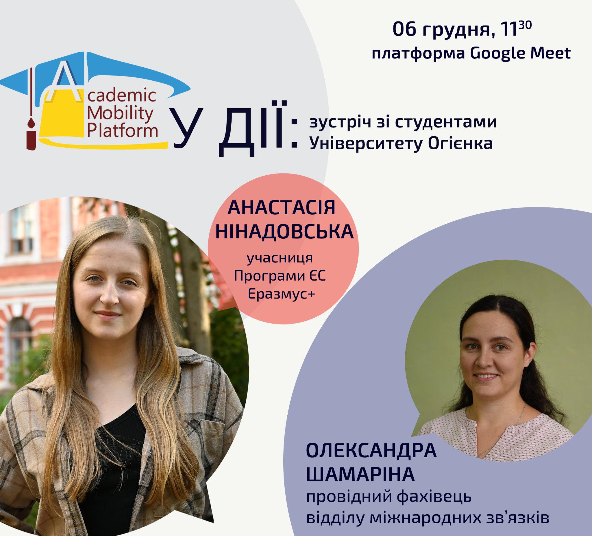 Запрошуємо студентів усіх факультетів на щотижневі онлайнові зустрічі з учасницями міжнародної академічної мобільності. Ви зможете дізнатися більше про Програму ЄС Еразмус+, а також отримати відповіді на свої запитання.