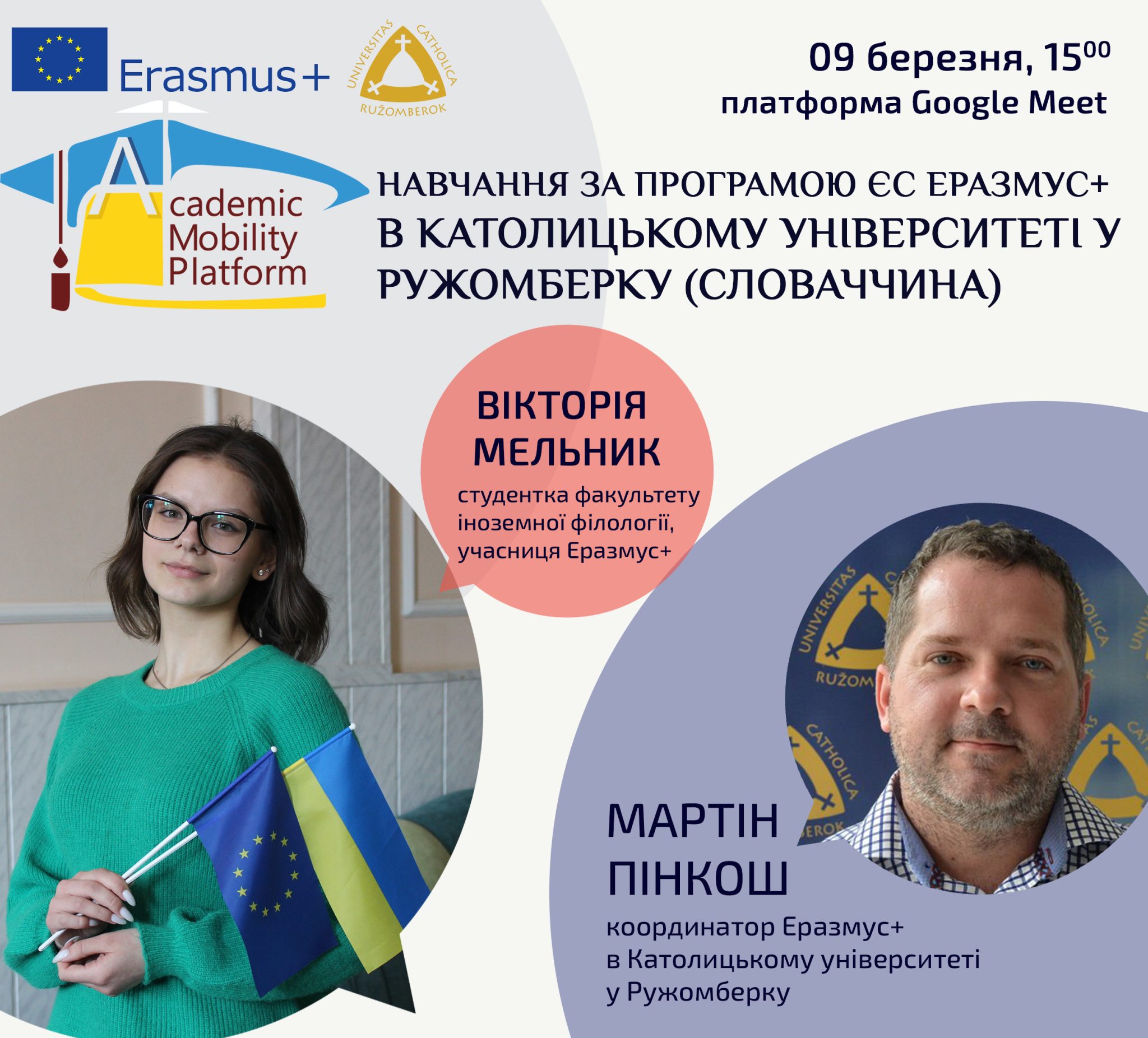 У межах Програми ЄС Еразмус+ за напрямом КА171: міжнародна кредитна мобільність в Католицькому університеті в Ружомберку (м. Ружомберок, Словаччина) навчалися Олександра Стара, студентка навчально-наукового інституту української філології та журналістики (2019 р.), Владислава Лісова, студентка факультету іноземної філології (2020 р.), а також зараз навчається Вікторія Мельник, студентка факультету іноземної філології.
