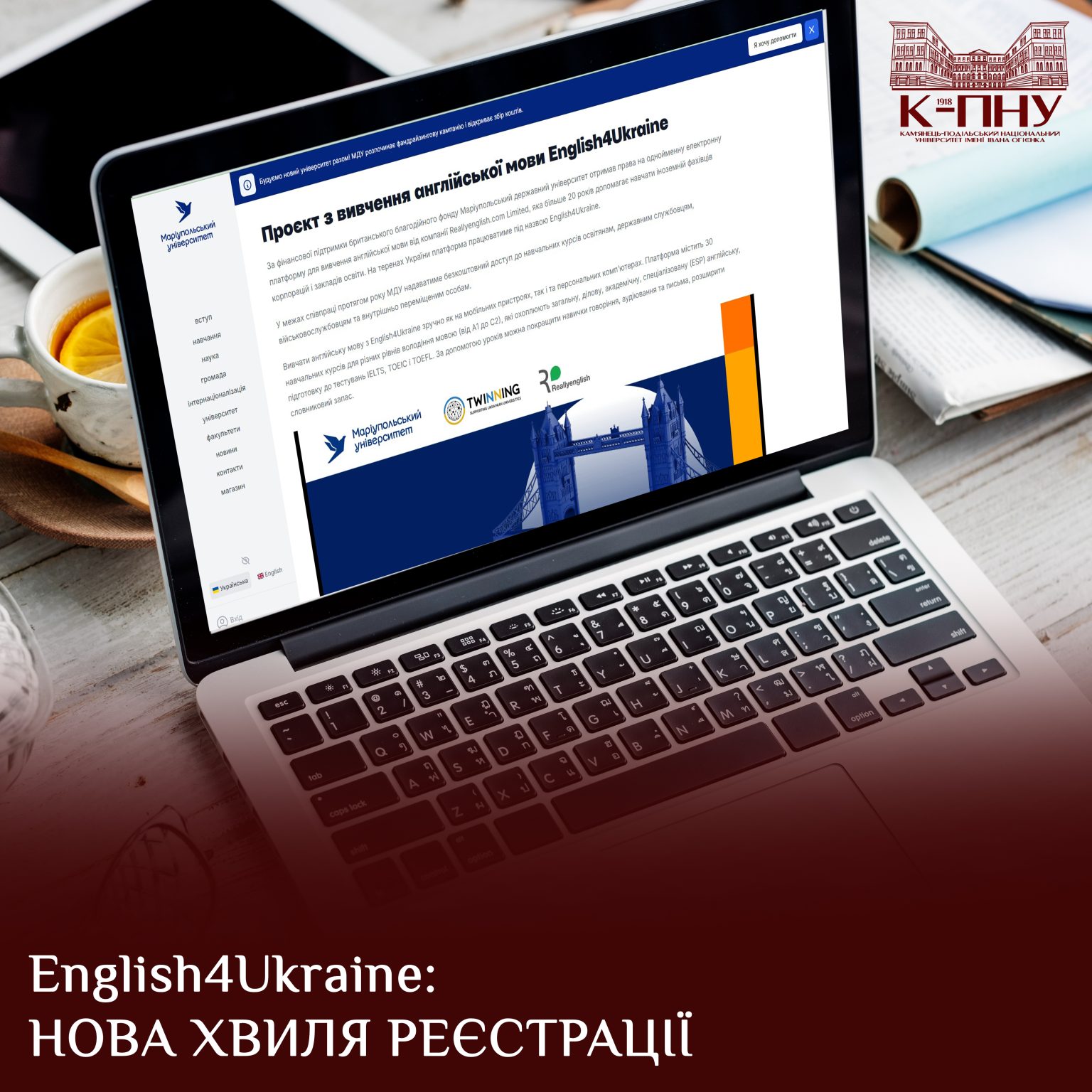 Університет Огієнка оголошує 3 хвилю реєстрації на платформу English4Ukraine для вивчення англійської мови за підтримки програми «Twinning» та Маріупольського державного університету.