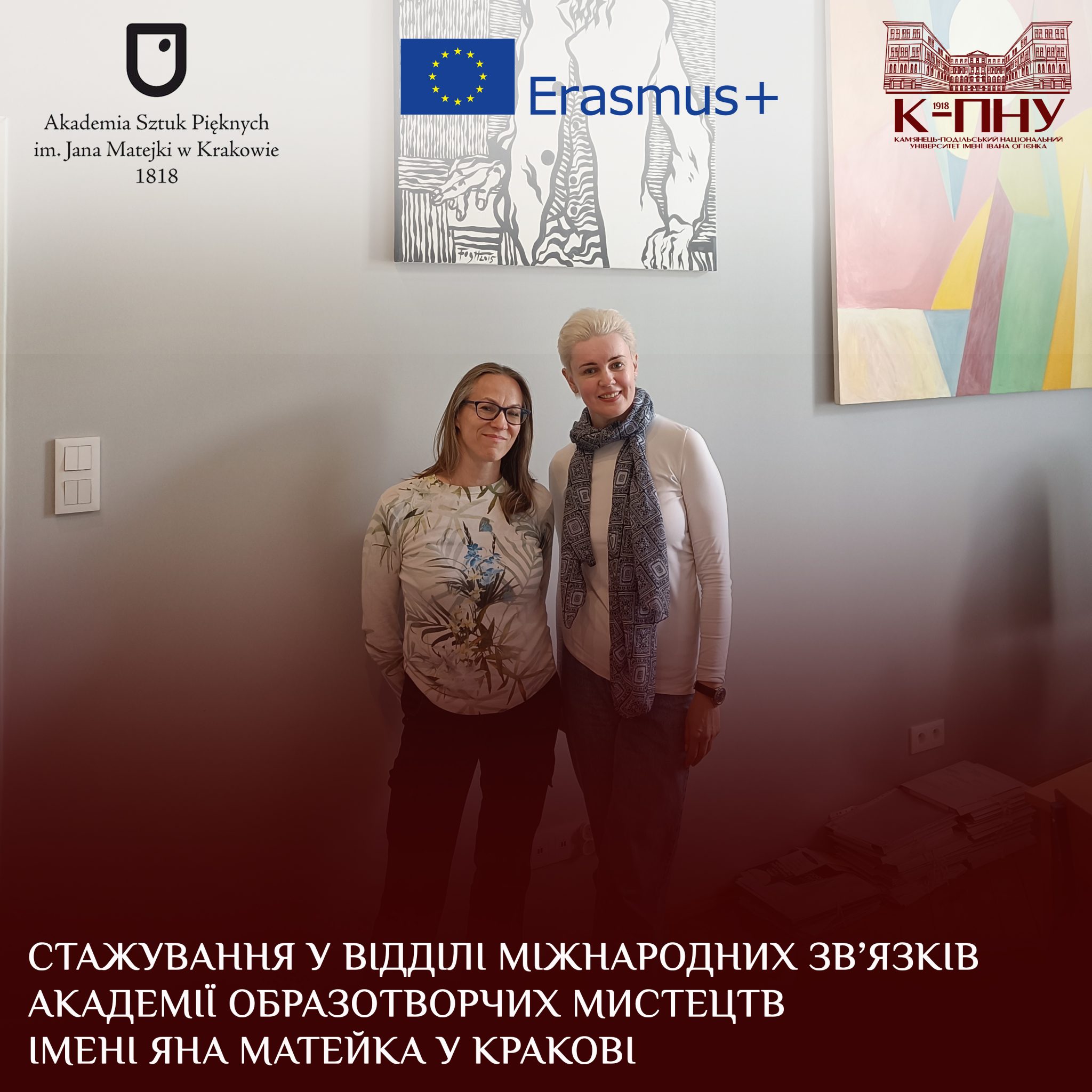 14-18 квітня 2025 року керівник відділу міжнародних зв’язків, доцент Тетяна Сторчова проходила стажування у відділі міжнародних зв’язків Академії образотворчих мистецтв імені Яна Матейка у Кракові в межах Програми ЄС Еразмус+.