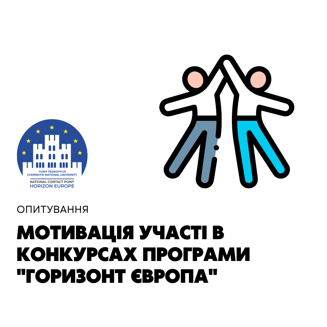 Національний контактний пункт «Горизонт Європа. Культура, креативність та інклюзивне суспільство» Чернівецького національного університету імені Юрія Федьковича проводить опитування щодо Вашого досвіду та мотивації участі в конкурсах програми «Горизонт Європа».